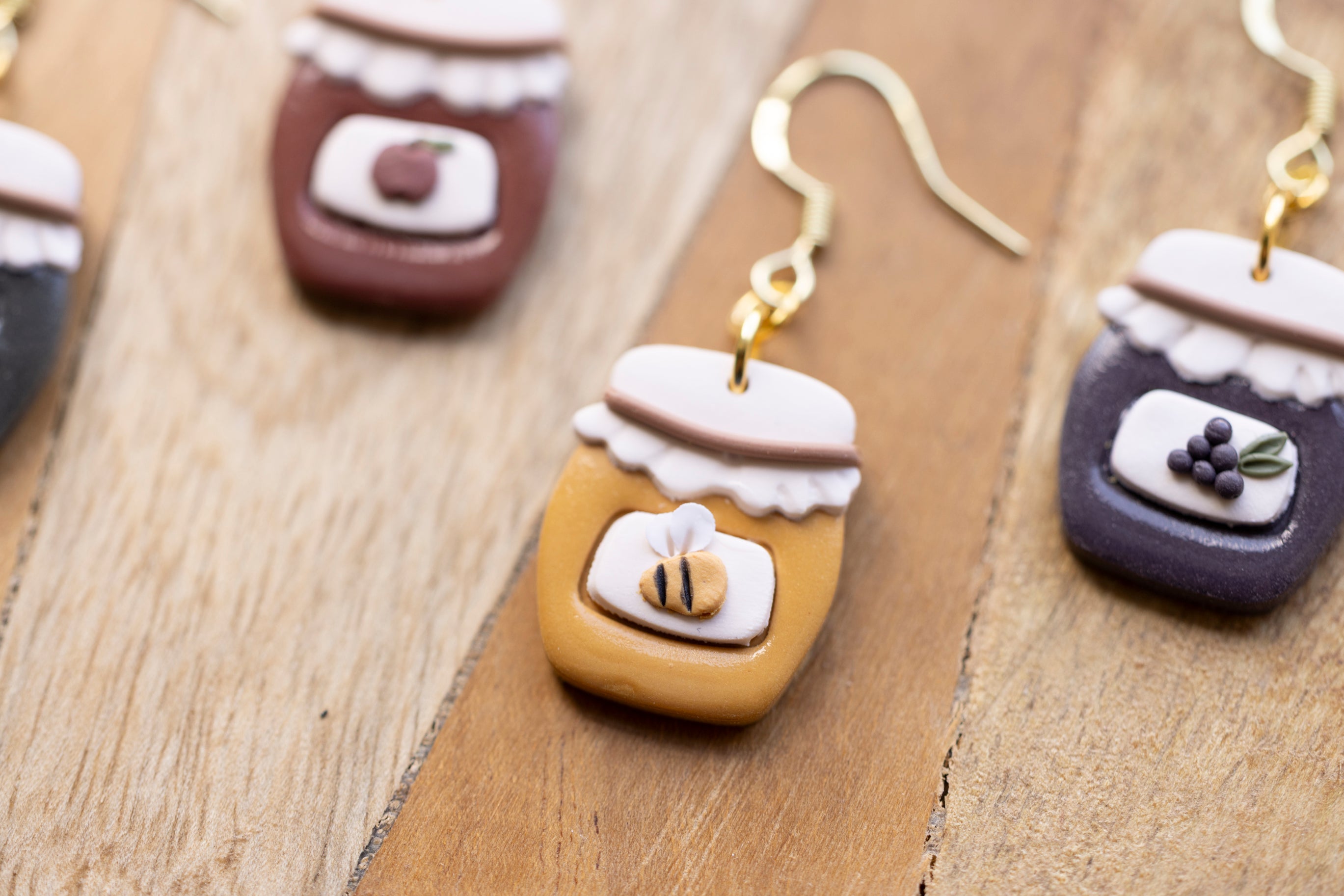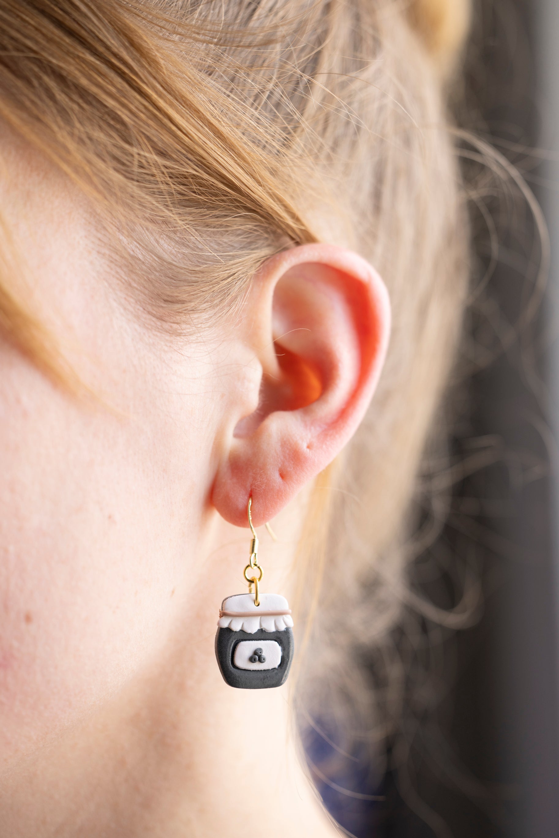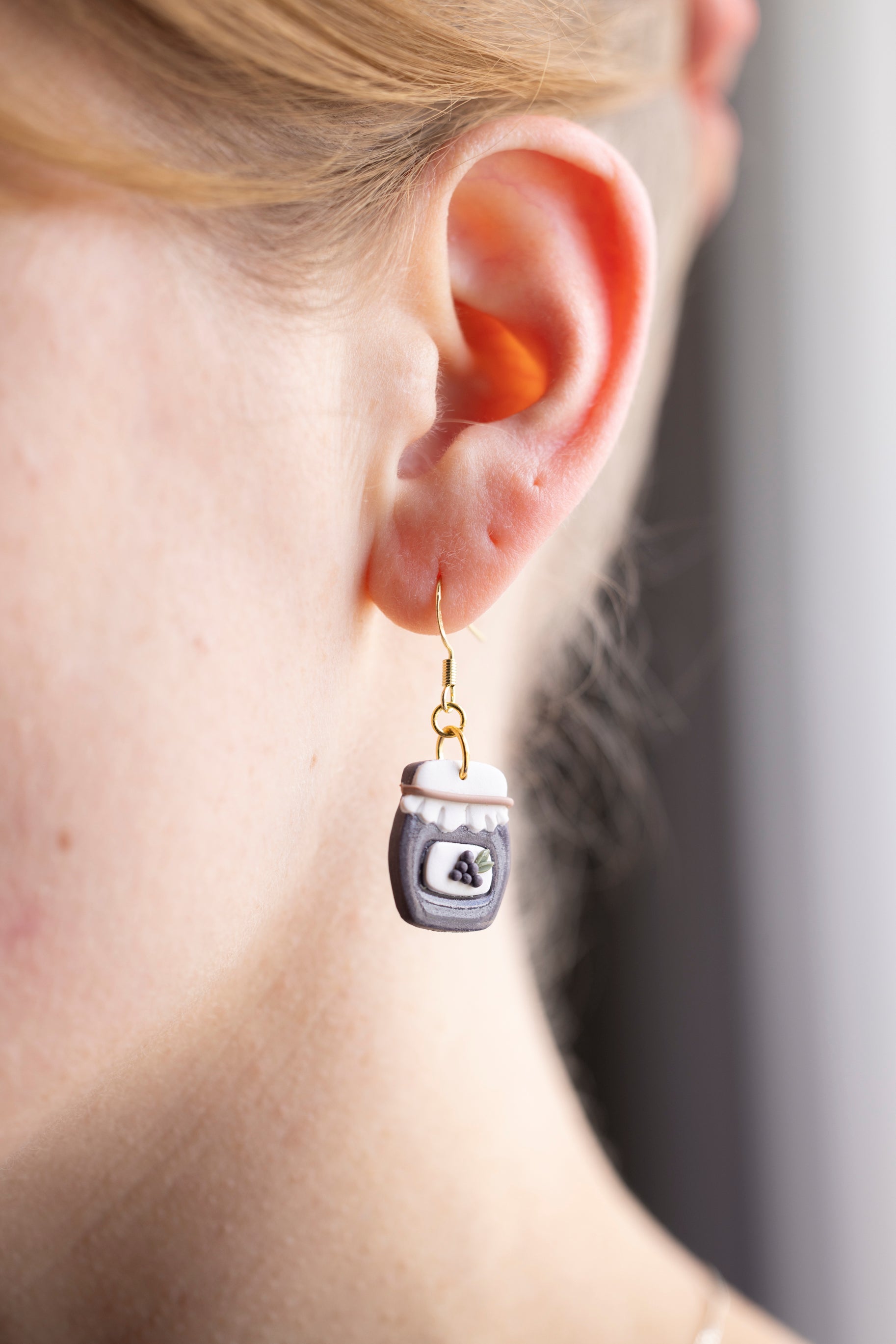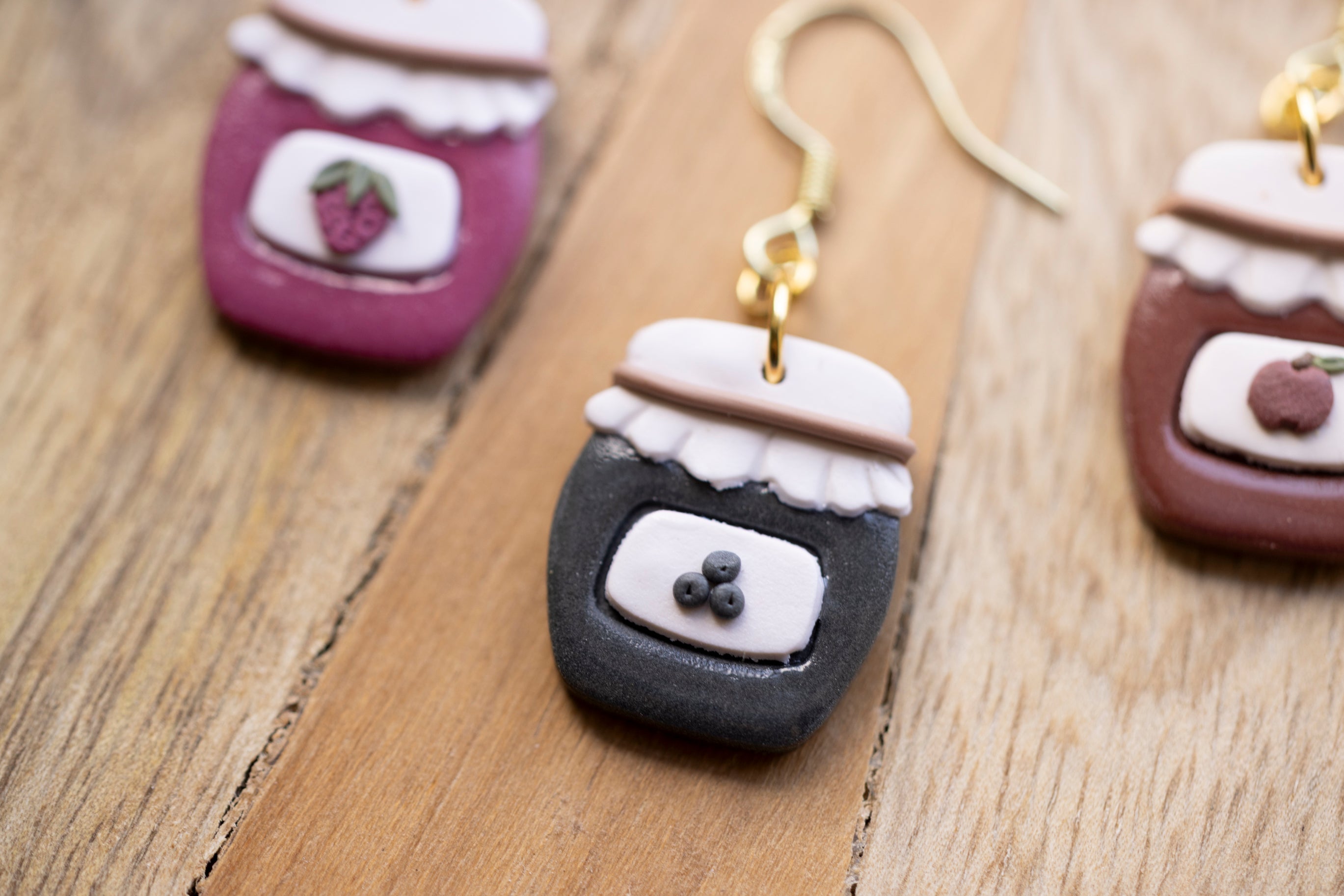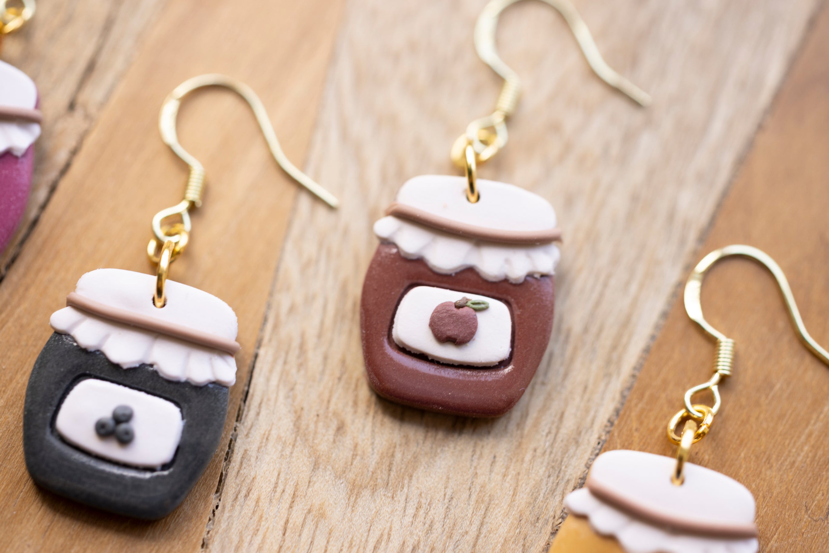Bring a little country charm to your jewelry box with our Farmhouse Flavors collection — a sweet lineup of handcrafted polymer clay earrings inspired by your favorite pantry staples. Featuring five cozy "flavors" — apple butter, honey, grape jam, strawberry jam, and blueberry jam — each earring is sculpted with care to look like a mini mason jar, complete with a ruffled lid and a tiny fruit label.